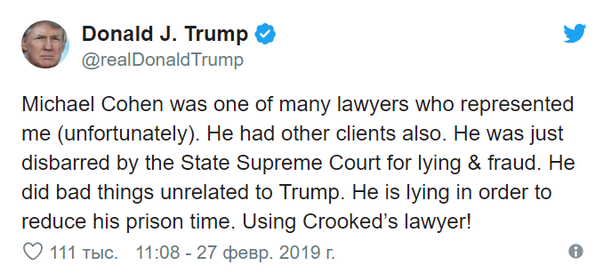 "Майкл Коэн был одним из многих юристов, которые меня представляли (к сожалению). У него были и другие клиенты. Он только что был лишен адвокатского звания Верховным судом за ложь и мошенничество. Он совершал дурные поступки, не имеющие отношения к Трампу. Он лжет, чтобы сократить свой срок в тюрьме. Нечестный юрист!" - написал президент США в "Твиттере".