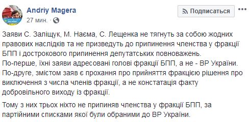 "Заявления Залищук, Найема, Лещенко не влекут за собой никаких правовых последствий и не приведут к прекращению членства во фракции БПП и досрочного прекращения депутатских полномочий. Во-первых, их заявления адресованы главе фракции БПП, а не ВР Украины. Во-вторых, содержанием заявлений есть просьба о принятия фракцией решения об исключении из числа членов фракции, а не констатация факта добровольного выхода из фракции", - напиал Магера. Он делает вывод, "из них троих никто не прекращал членства во фракции БПП, по партийным спискам которой были избраны в ВР Украины".