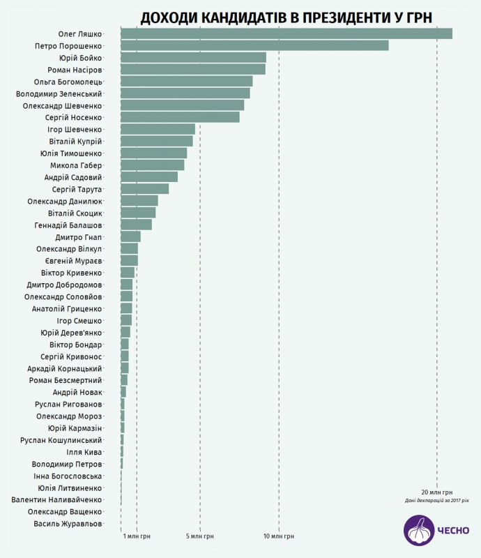По данным "Чесно", наибольший доход в 2017 году получил лидер Радикальной партии Олег Ляшко. Большую его часть - около 16 млн грн - составила продажа недвижимости. Порошенко заработал на 4 миллиона меньше.