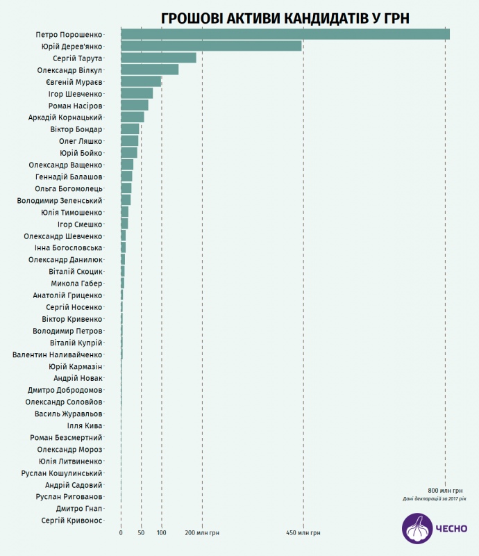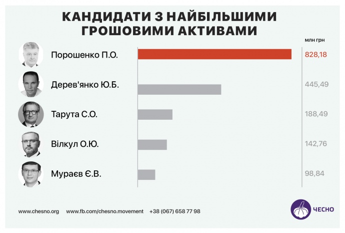 Согласно анализу, общая сумма денежных активов кандидатов достигает 2,23 млрд грн, доходов – 129,58 млн грн, больше всего – у Порошенко (828,18 млн) и внефракционного нардепа-мажоритарщика Юрия Деревянко (445,49 млн), которого выдвинула партия "Воля".