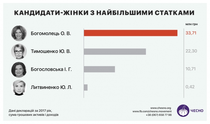 Среди женщин самой богатой оказалась народный депутат Ольга Богомолец ("Блок Петра Порошенко"). Ее доходы за 2017 год достигли 8,32 млн грн, из которых значительную часть она получила от предоставления в аренду собственной недвижимости, в том числе от Посольства США в Украине - за помещение на улице Сикорского. Лидер "Батькивщины" Юлия Тимошенко своим финансовым успехом обязана преимущественно мужу. У журналистки Юлии Литвиненко наименьшие доходы.
