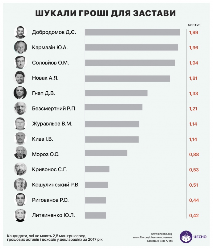При этом расследование установило, что 13 кандидатов по итогам 2017 года не имели достаточного количества денежных активов и доходов, а следовательно, не могли внести залог в 2,5 млн грн из собственных средств для участия в выборах.