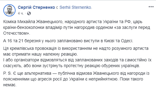 Стерненко поставил ультиматум перед организаторами выступлений сатирика, подчеркнув, что если они сами не отменят концерты, то в противном случае последует "протестная реакция".