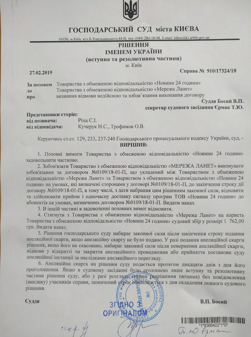 "Обязать ООО "Мережа Ланет" исполнять обязательства по договору, который был подписан с ТОВ "Новини 24 години" телеканал NewsOne на условиях, определенных сторонами до окончания срока действия договора, а также возобновить и осуществлять прием и одновременную доставку сигнала телеканала NewsOne до абонентов", - говорится  в постановлении суда.