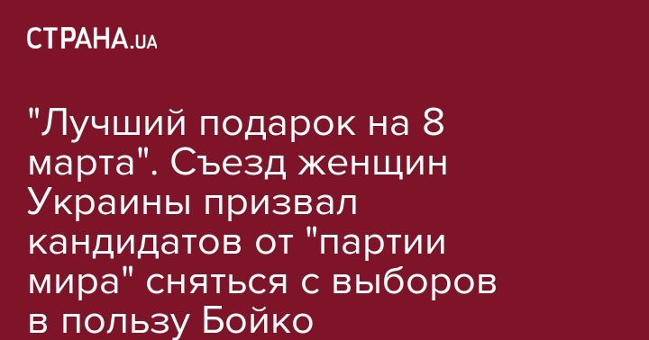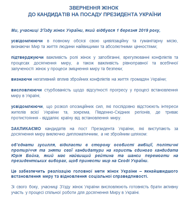 "Сегодня женщины, представляющие все регионы страны, обратились к кандидатам в президенты Украины с призывом объединить усилия, отложить в сторону все политические амбиции, противоречия и снять свои кандидатуры в пользу единого кандидата Юрия Бойко, который имеет наивысший рейтинг и шансы на победу, чтобы как можно быстрее вернуть мир в Донбасс. Для женщин – это будет лучшим подарком на 8 марта", – заявила инициатор Национальной платформы "Женщины за Мир" Наталия Королевская.