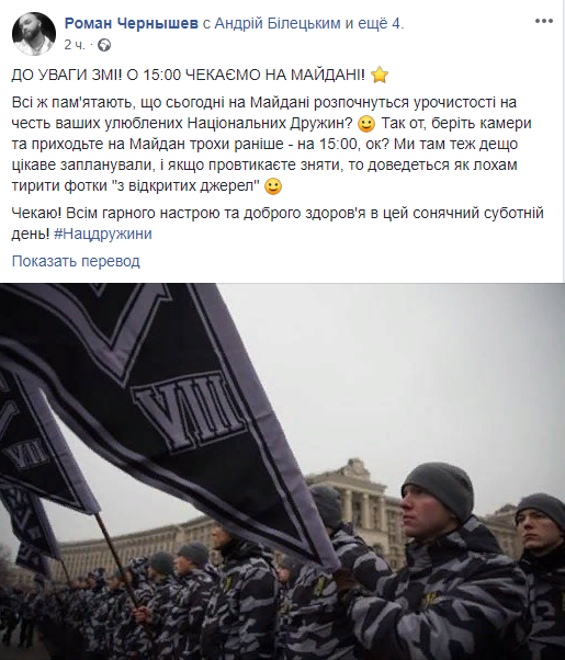 "Все же помнят, что сегодня на Майдане начнутся торжества в честь ваших любимых Национальных Дружин? Так вот, берите камеру и приходите на Майдан чуть раньше - на 15:00, ок? Мы там тоже кое-что интересное запланировали, и если провтыкаете снять, то придется как лохам тырить фотки "из открытых источников". Жду! Всем хорошего настроения и доброго здоровья в этот солнечный субботний день!", - пишет Чернышев.