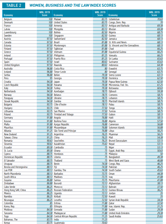Индекс оценил восемь показателей, которые влияют на экономические решения, которые женщины делают в течение трудовой жизни - от свободы передвижения до получения пенсии - отслеживая правовые блоки как для трудоустройства, так и для предпринимательства. Каждая страна была оценена по шкале в 100 баллов.
