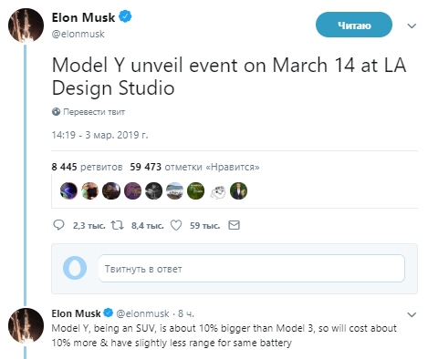 По словам Маска, Model Y получит  "нормальные" двери в отличие от дверей "Крылья Сокола", которые установлены на Model X.  Также Model Y будет стоить примерно на 10% дороже, чем Model 3, поскольку это более крупный внедорожник.