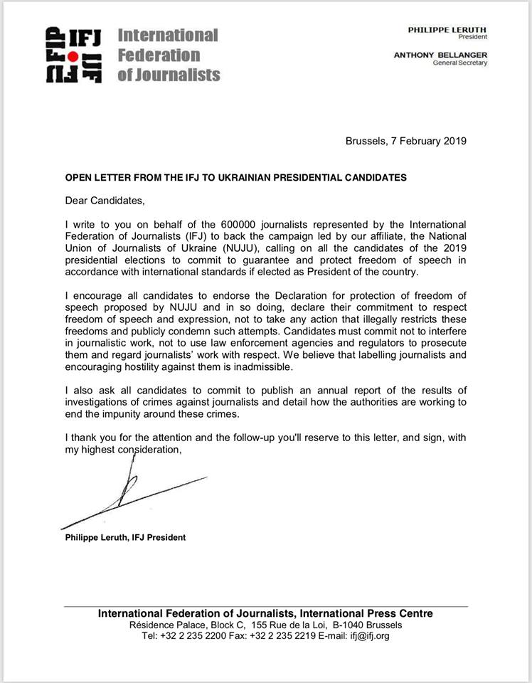 "Я призываю всех кандидатов принять Декларацию в защиту свободы слова, разработанную НСЖУ, и таким образом заявить о своей готовности уважать свободу слова и самовыражения, не совершать никаких действий, неправомерно ограничивающих эти свободы и публично осуждать такие попытки", - подчеркнул глава МФЖ Филипп Ляруш.