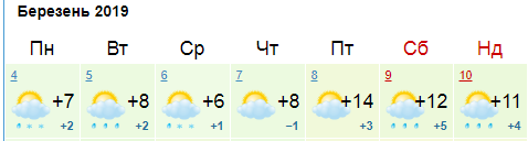 Ресурс Мeteoprog.ua обещает +8...+10 и дождь 4 и 5 марта. Среда, по данным этого ресурса, будет немного прохладнее, до +6 днем. В четверг-пятницу, 7 и 8 марта, потеплеет до +11, осадков не будет. Выходные будут мокрыми, дневная температура +7...+9.