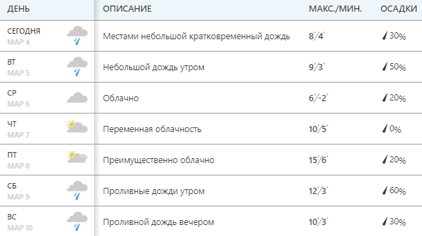 Сайт Weather.com также сообщает, что самым теплым днем недели станет 8 марта, когда воздух прогреется до +15. В остальные дни от +6 до +12. В понедельник-вторник - дождь. Выходные 9 и 10 марта также могут подпортить обильные осадки.