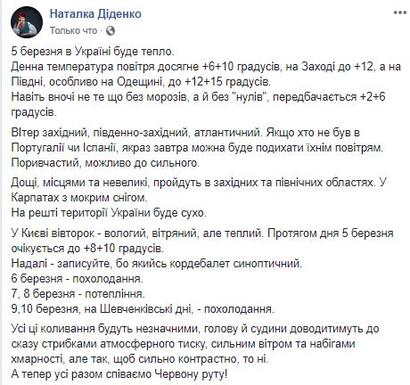 Синоптик ресурса Opogode Наталья Диденко сообщает, что 5 марта по всей стране будет тепло. На юге потеплеет до +12...+15. Ветер порывистый. Местами дождь, в Карпатах - со снегом. В Киеве во вторник синоптик обещает влажную и ветреную, но теплую погоду - до +8...+10.
