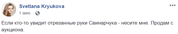 "Если кто-то увидит отрезанные руки Свинарчука (первая фамилия Гладковского. – Прим. ред.) – несите мне. Продам с аукциона", – пишет заместитель главного редактора "Страны" Светлана Крюкова у себя в Facebook, напоминая, что Порошенко когда-то обещал "руки поотрубать тем, кто крадет у армии".