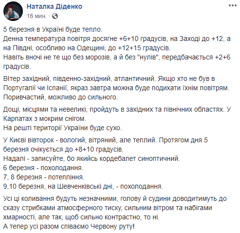 "Далее - записывайте, потому что какой-то кордебалет синоптический. 6 марта - похолодание. 7, 8 марта - потепление. 9,10 марта, на Шевченковские дни, - похолодание", - написала Диденко.