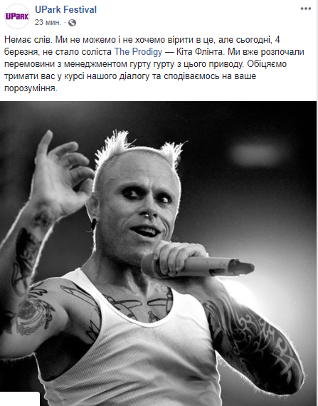 Позже группа The Prodigy сообщила, что отменяет все предстоящие концерты. А организаторы фестиваля UPark Festival, который пройдет с 16 по 18 июля в Киеве, заявили, что вернут деньги за билеты на фестиваль в связи с отменой концерта The Prodigy.