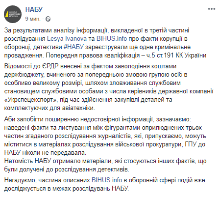 После публикации третьей части расследования журналистов программы "Наши гроши" Бигуса и Ивановой о хищениях окружения президента Порошенко в сфере оборонной промышленности Украины Национальное антикоррупционное бюро зарегистрировали еще одно уголовное производство по данному факту. Об этом сообщает пресс-служба НАБУ на странице в Facebook.