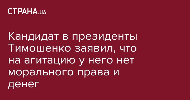 Кандидат в президенты, самовыдвиженец Юрий Тимошенко заявил, что не проводит встреч с избирателями и не ведет президентской кампании, потому что ему не хватает средств и он не имеет на это морального права. Об этом он рассказал в комментарии движению Чесно.