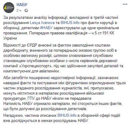 "Чтобы предотвратить распространение недостоверной информации, отмечаем: приведенные факты и переписка между фигурантами обнародованных трех частей упомянутого расследования журналистов, которые, предполагаем, могут содержаться в материалах расследования военной прокуратуры, ГПУ в НАБУ никогда не передавала", - говорится в сообщении.