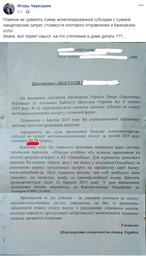 "Главное не сравнять сумму монетизированной субсидии с суммой канцелярских затрат, стоимости почтового отправления и банковских услуг. Иначе, всё теряет смысл, на что утепление в доме делать?", - написал Черкашин.