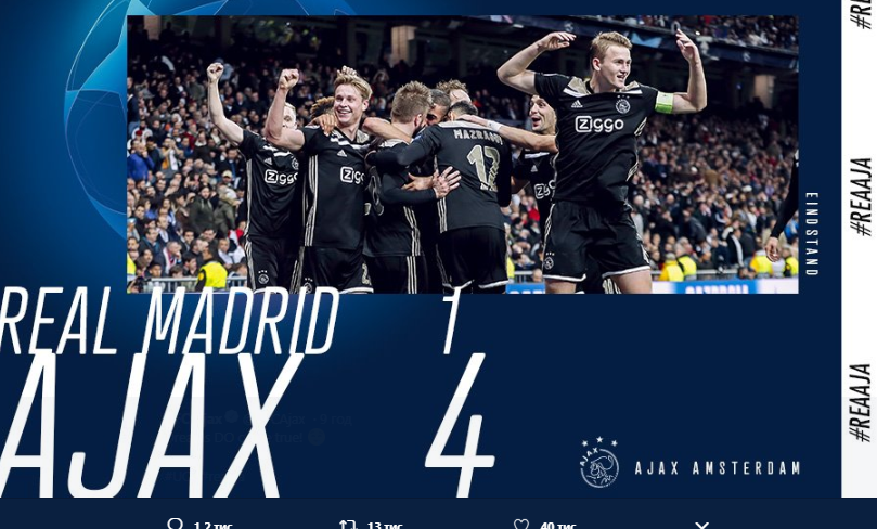 Вчера, 5 марта, миллионы футбольных болельщиков во всем мире стали свидетелями того, как на их глазах творилась история. На забитом до отказа стадионе "Сантьяго Бернабеу" прошел ответный матч 1/8 Лиги чемпионов. И Аякс буквально уничтожил мадридский Реал, бессменного триумфатора Лиги чемпионов трех минувших лет.