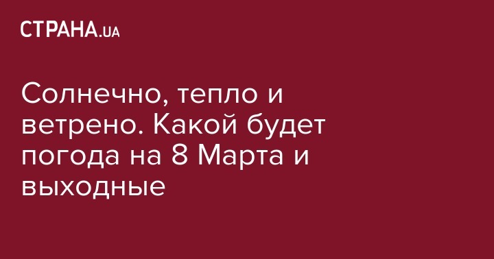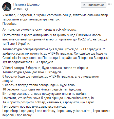 В четверг, 7 марта, в Украине будет солнечно, тепло, но ветрено. Об этом на своей странице в Facebook сообщила синоптик Наталья Диденко.