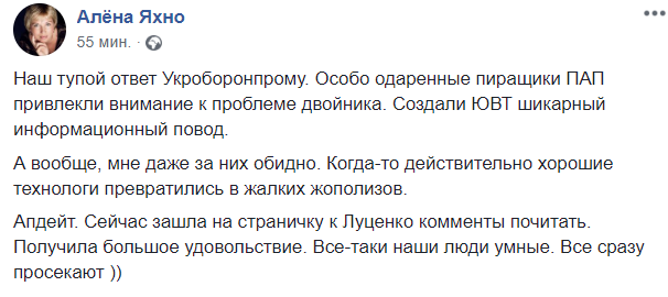 "Наш тупой ответ Укроборонпрому. Особо одаренные пиращики ПАП привлекли внимание к проблеме двойника. Создали ЮВТ шикарный информационный повод.