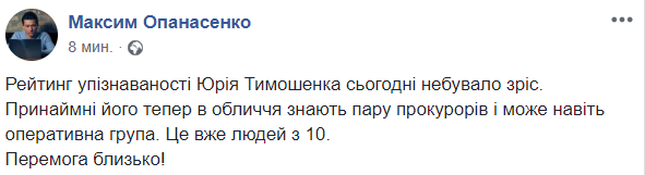 Рейтинг узнаваемости Юрия Тимошенко сегодня небывало возрос. По крайней мере его теперь в лицо знают пара прокуроров и может даже оперативная группа. Это уже человек 10. Победа близка", - пишет журналист Максим Опанасенко.