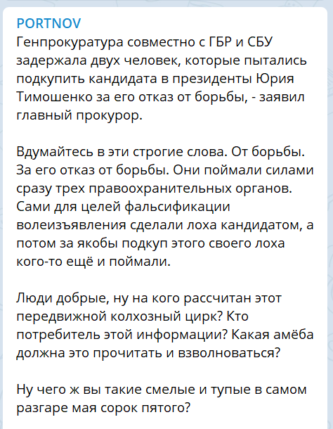Он отметил, что в свою очередь, кандидат в президенты, осознавая, что злоумышленники своими действиями побуждают его к совершению преступления, обратился с соответствующим заявлением в Генеральную прокуратуру Украины.