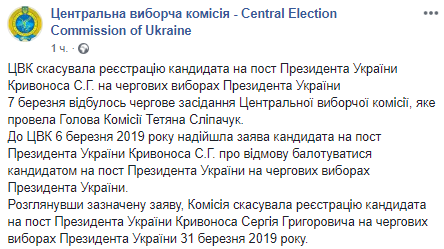 Уточняется, что 7 марта состоялось очередное заседание комиссии. "В ЦИК 6 марта 2019 года поступило заявление кандидата на пост президента Украины Кривоноса С.Г. об отказе баллотироваться кандидатом. Рассмотрев указанное заявление, комиссия отменила регистрацию кандидата на пост президента Украины Кривоноса Сергея Григорьевича на очередных выборах президента Украины 31 марта 2019 года", - говорится в сообщении.