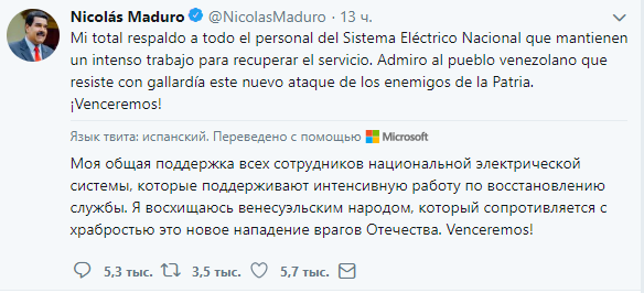 Президент Венесуэлы Николас Мадуро и лидер оппозиции Хуан Гуайдо также устроили спор в соцсети Twitter из-за отключении электроэнергии по всей стране. "Я полностью поддерживаю сотрудников Национальной системы электроснабжения, которые напряженно работают над восстановлением подачи электричества. Я восхищаюсь народом Венесуэлы, который, не унывая, сопротивляется этой новой атаке врагов Родины. Мы победим", - написал Мадуро.