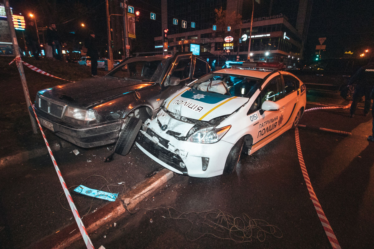 Оказалось, что Lancia была угнана ранее. Полицейские попытались остановить машину, которая проходила по ориентировкам, однако человек за рулем не затормозил и продолжил движение по улице Антоновича в сторону Лыбедской площади. Перед перекрестком с улицей Загородней патрульные выровнялись с Lancia, но ее водитель резко повернул влево и въехал машину правоохранителей. От удара оба автомобиля вылетели с проезжей части и остановились в парапете.
