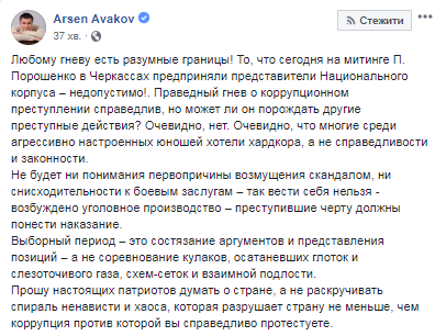 "Любому гневу есть разумные границы! То, что сегодня на митинге Порошенко в Черкассах предприняли представители Национального корпуса - недопустимо! Праведный гнев о коррупционном преступлении справедлив, но может ли он порождать другие преступные действия? Очевидно, нет. Очевидно, что многие среди агрессивно настроенных юношей хотели хард-кора, а не справедливости и законности.