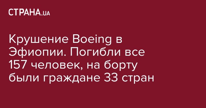 Во время крушения лайнера Boeing 737 авиакомпании Ethiopian Airlines в Эфиопии погибли все 157 человек, которые находились на борту самолета. Об этом сообщает агентство Reuters со ссылкой на местные СМИ.