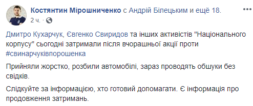 Член "Национального корпуса" Константин Мирошниченко в Facebook добавил, что полиция задержала Дмитрия Кухарчука и Евгения Свиридова.