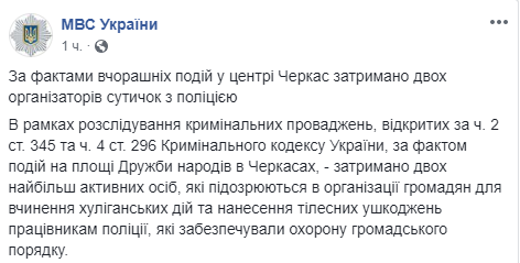 Также полиция открыла уголовные дела по двум статьям после стычек с Нацкорпусом в Киеве и Черкассах.