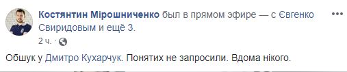 "Приняли жестко, разбили автомобили, сейчас проводят обыски без свидетелей... Обыск в Дмитрий Кухарчук. Понятых не пригласили. Дома никого", - отметил он в Facebook.