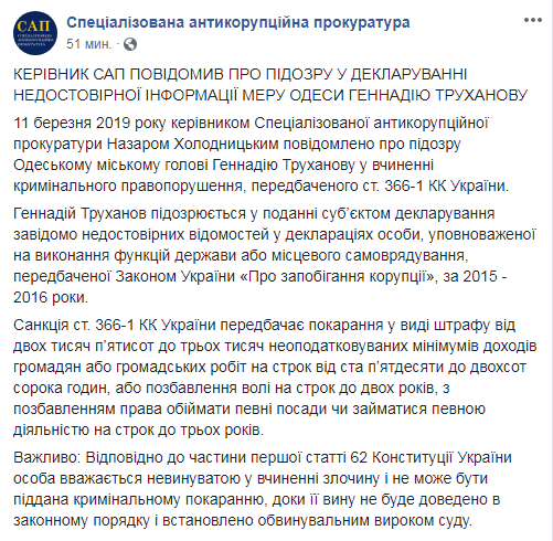 По данным пресс-службы САП, 11 марта 2019 глава ведомства Назар Холодницкий сообщил о подозрении Одесскому городскому голове Геннадию Труханову в совершении уголовного преступления, предусмотренного ст. 366-1 УК Украины.