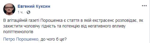 В предвыборной газете президента Петра Порошенко экстрасенс рассказывает, как защитить мужское достоинство и потенцию от негативного влияния политических технологов. Об этом на своей странице в соцсети Facebook сообщил журналист Евгений Куксин и выложил соответствующий скришот.