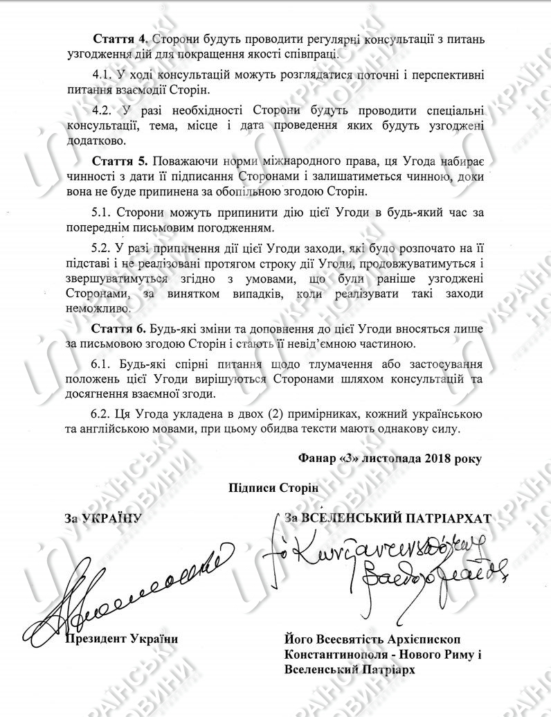 Об этом говорится в копии соглашения о сотрудничестве и взаимодействии между Украиной и Вселенским Константинопольским патриархатом, предоставленной Администрацией Президента на запрос Украинских Новостей.