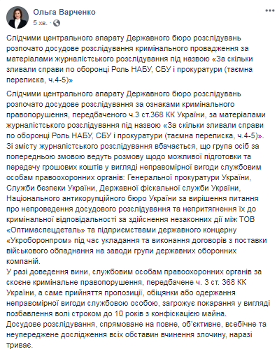 "Из содержания журналистского расследования следует, что группа лиц по предварительному сговору вела разговоры о возможной подготовке и передаче денежных средств в виде неправомерной выгоды должностным лицам правоохранительных органов: Генеральной прокуратуры Украины, Службы безопасности Украины, Государственной фискальной службы Украины, Национального антикоррупционного бюро Украины за решение вопроса о непроведении досудебного расследования и непривлечении их к уголовной ответственности за совершение незаконных действия между ООО "Оптимаспецдеталь" и предприятиями государственного концерна" Укроборонпром "при заключении и исполнении договоров по поставке военного оборудования на заводы группы государственных оборонных компаний.