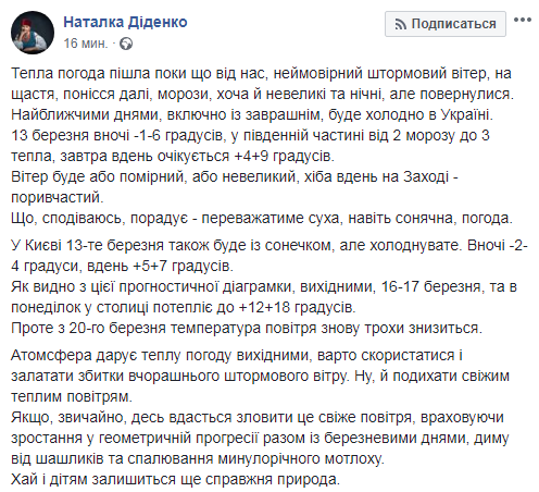 По словам Диденко, в ближайшие дни, включая завтрашний, в Украине будет холодно. 13 марта ночью -1...-6 градусов, в южной части -2...+3 градуса, днем ожидается +4...+9 градусов. Ветер будет или слабый, или небольшой, разве что днем на западе - порывистый. Кроме того, в этот день будет преобладать сухая, даже солнечная, погода.