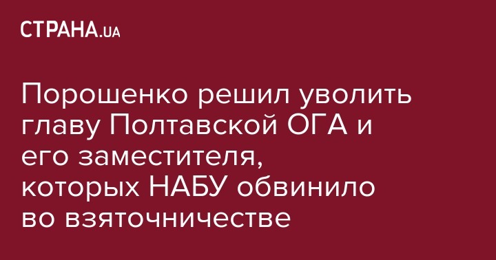 Президент Украины Петр Порошенко решил уволить главу Полтавской ОГА Валерия Головко и его первого заместителя, которых НАБУ заподозрило в вымогательстве от предпринимателей миллионных откатов. Об этом пишет "Интерфакс-Украина"