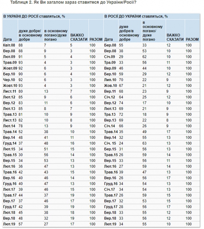 В феврале 2019 года количество украинцев, которые хорошо или очень хорошо относятся к России, выросло сразу на 9 процентов. Позитивно относятся к ней относятся уже более половины населения Украины (57%).