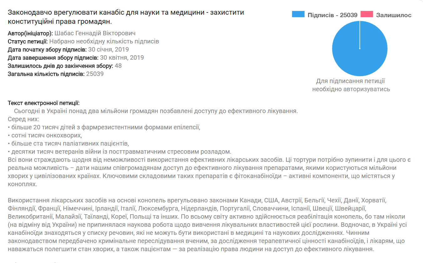 Петиция о легализации каннабиса в лечебных и научных целях на сайте Верховной Рады набрала 25 тысяч подписей. Об этом свидетельствуют данные на сайте украинского парламента.