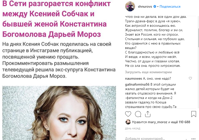 Стих Шнуров разместил под скрином новости о том, что между Ксений Собчак и Дарьей Мороз (бывшей супругой Константина Блогомолова, с которым Собчак приписывают роман) разгорелась ссора в Instagram.
