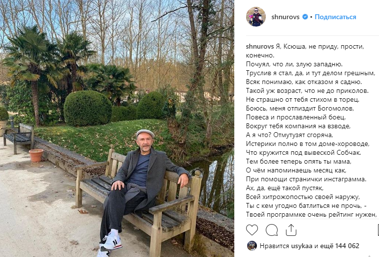 Кстати, это уже не первый наезд Шнурва и Собчак в Instagram друг на друга. Так в декабре Ксюша разметила пост с философской цитатой Ошо.