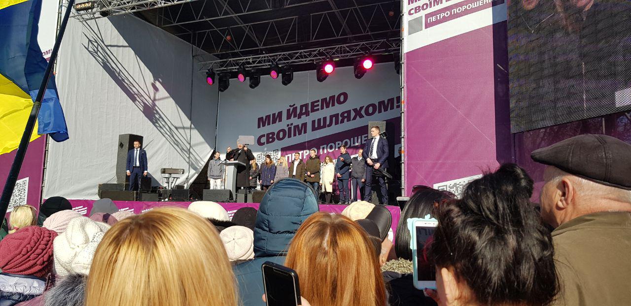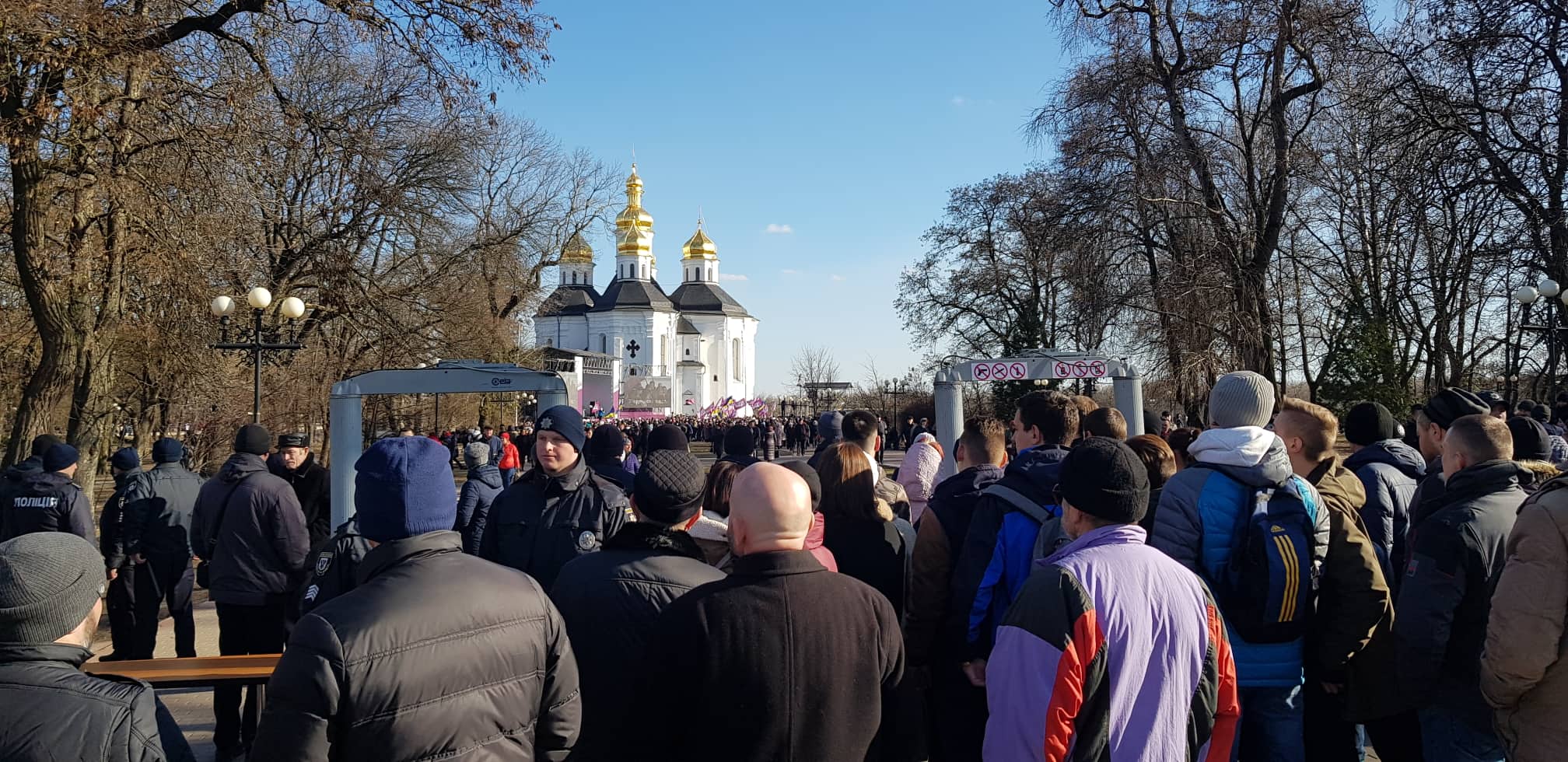 14:30 Очень усилены меры безопасности, перед металлоискателем, куда пускают не всех выстроилось 3-4 ряда правоохранителей. Перед самой сценой стоит массовка порядка тысячи человек, у многих плакаты с поддержкой Порошенко.