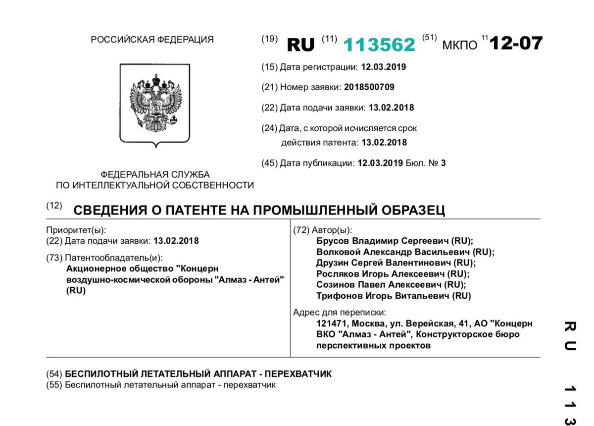 Во вторник, 12 марта в реестре Федеральной Службы Россиии по интеллектуальной собственности появился патент на промышленный образец беспилотного летательного аппарата-перехватчика, стрелковый комплекс которого создан на базе Калашникова. Об этом сообщается на сайте ведомства