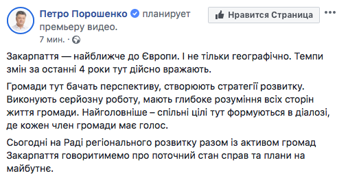 Параллельно в Facebook Порошенко появился анонс. "Сегодня на Совете регионального развития вместе с активом общин Закарпатья говорить о текущем состоянии дел и планах на будущее", - отмечалось в сообщении, которое через несколько минут оно было удалено.