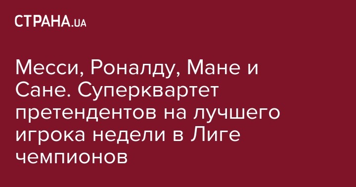 В список УЕФА на приз лучшему игроку недели в Лиге чемпионов вошли форвард Ювентуса Криштиану Роналду (хет-трик в матче с Атлетико), полузащитник Манчестер Сити Лерой Сане (гол и три ассиста в матче с Шальке), капитан Барселоны Лионель Месси (2 гола и 2 ассиста в матче с Лионом) и нападающий Ливерпуля Садьо Мане (дубль в матче с Баварией).